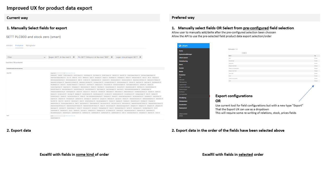 By creation of pre defined configurations for export we can make the export easier and adapted to differet types of work to be done and imported. Expale - a specification export for R&D, a text configuration for the marketing team to translate, A publishing configuration to prepare assortment and channel publishing together with fields.