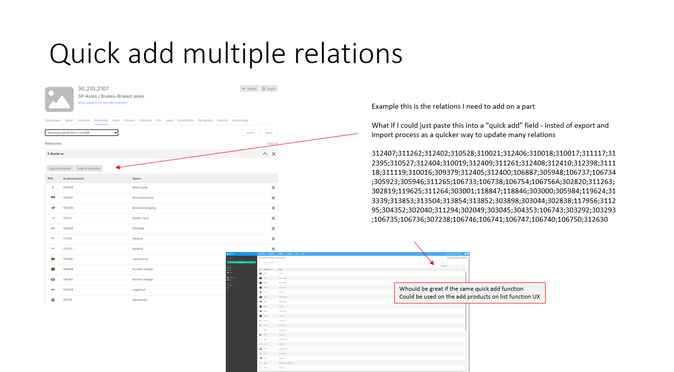 We sometime get a list of items that should be connected with another article - example a specifc sparapart/accessory fitts 35 products
