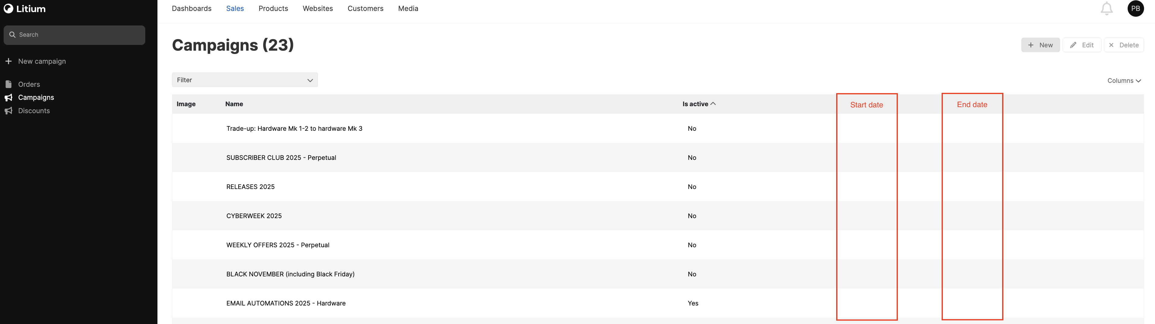 These fields already exist in the Discounts view, so the data is available. Displaying them in the Campaigns list would make it much easier to quickly determine whether a campaign is still valid or has already ended, without needing to open each campaign individually.